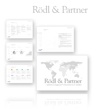 Erstellung und Druckabwicklung der Geschäftsausstattung Briefpapiere, Kuverte, Visitenkarten, Imagekarten Kreation und Organisation der hochwertigen, gebundenen Mappen mit eingeprägtem Rödl-Logo, in Zusammenarbeit mit den Buchbindern